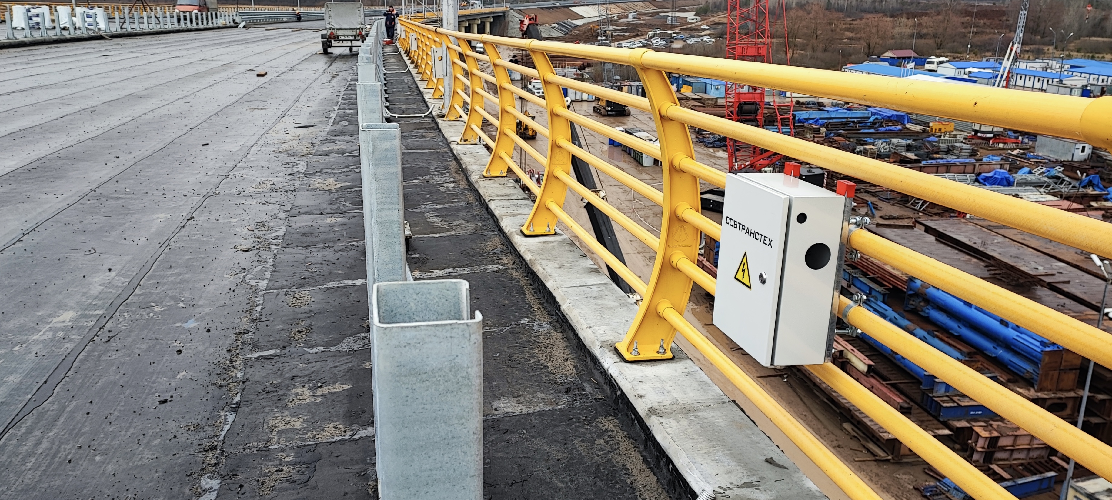 Противогололедный комплекс поможет предотвратить и устранить зимнюю скользкость на покрытии моста. Оборудование имеет спецдатчики. Они фиксируют состояние дороги, а также определяют толщину водяной пленки, концентрацию противогололедного реагента, температуру покрытия и даже степень износа верхнего слоя асфальта. Если возникнет обледенение, датчики подадут команду на распределение реагента.