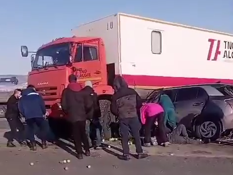 На кадрах видно, что под фуру залетел внедорожник. Передняя часть авто сильно искорежена. Первыми на помощь поспешили проезжавшие мимо люди.