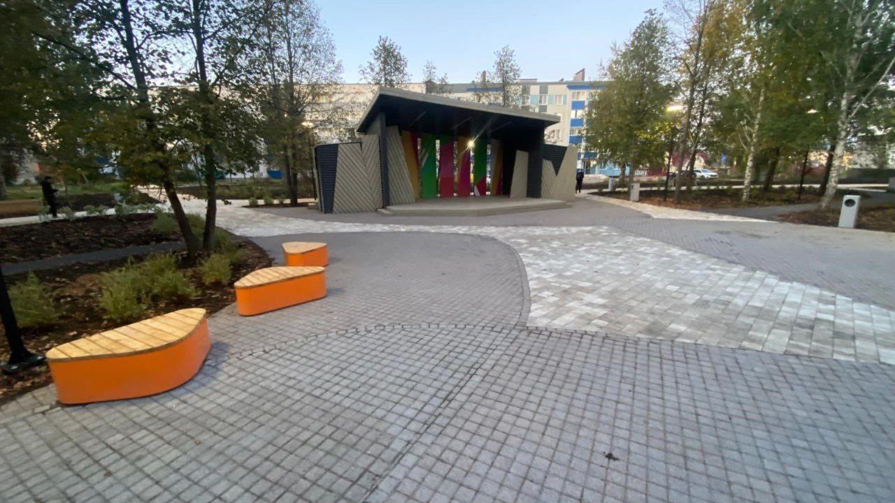 По данным чиновников, в сквере специалисты выполнили работы по укладке брусчатки и устройству освещения. Кроме того, здесь установили малые архитектурные формы. На территории общественного пространства разместили урны, скамейки, сцену и амфитеатр.