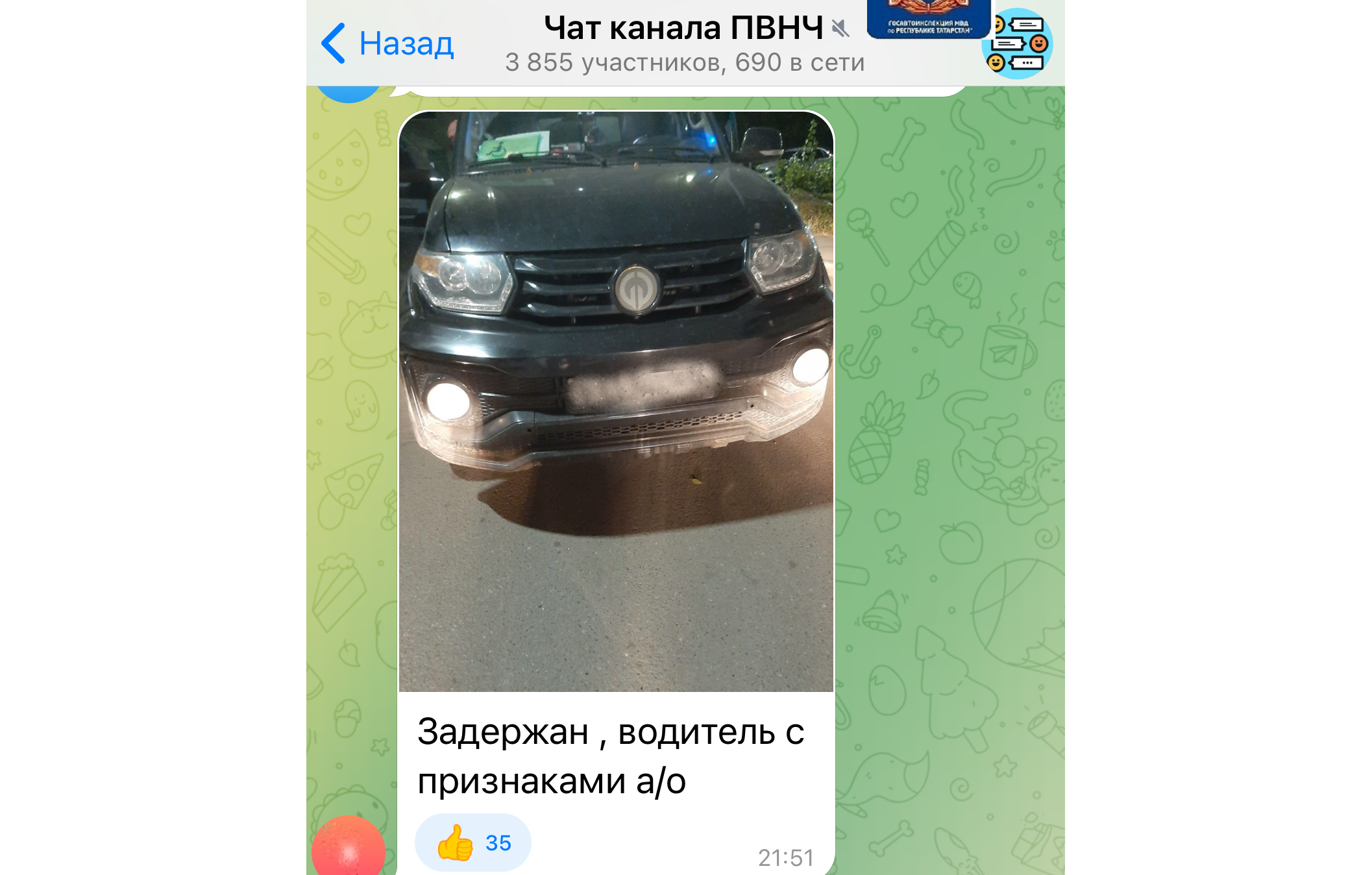 В Набережных Челнах задержали пьяного водителя автомобиля «УАЗ Патриот». Мужчину поймали благодаря чату сотрудников ГИБДД в Телеграме.
