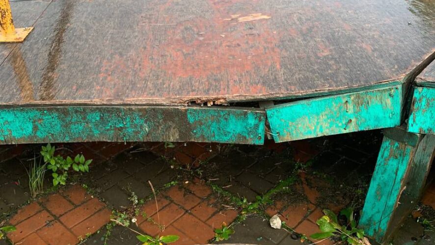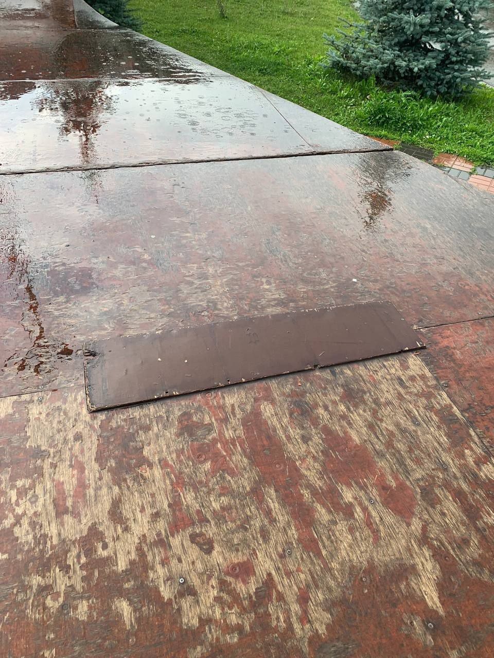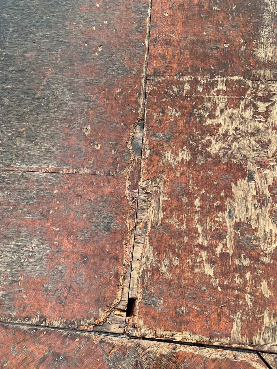 На объекте видны дыры, торчащие доски, ободранное покрытие, местами заметны «заплатки».