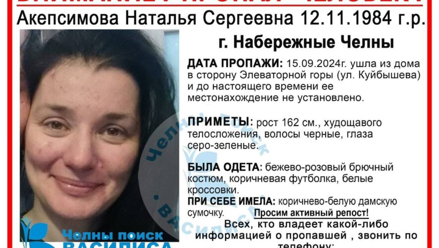 Жительница Челнов Наталья Акепсимова, которая ушла из дома около месяца назад, до сих пор числится пропавшей. Женщина отправилась в сторону Элеваторной горы (улица Куйбышева) к бывшей свекрови, но до места назначения не дошла.