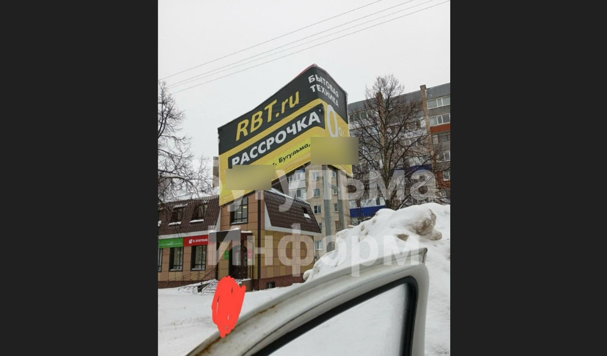 Жители Бугульмы обеспокоены из-за рекламного щита, который сильно погнулся от сильного ветра. Фотографией с места, где людям грозит опасность, поделился в местном Телеграм-канале горожанин.