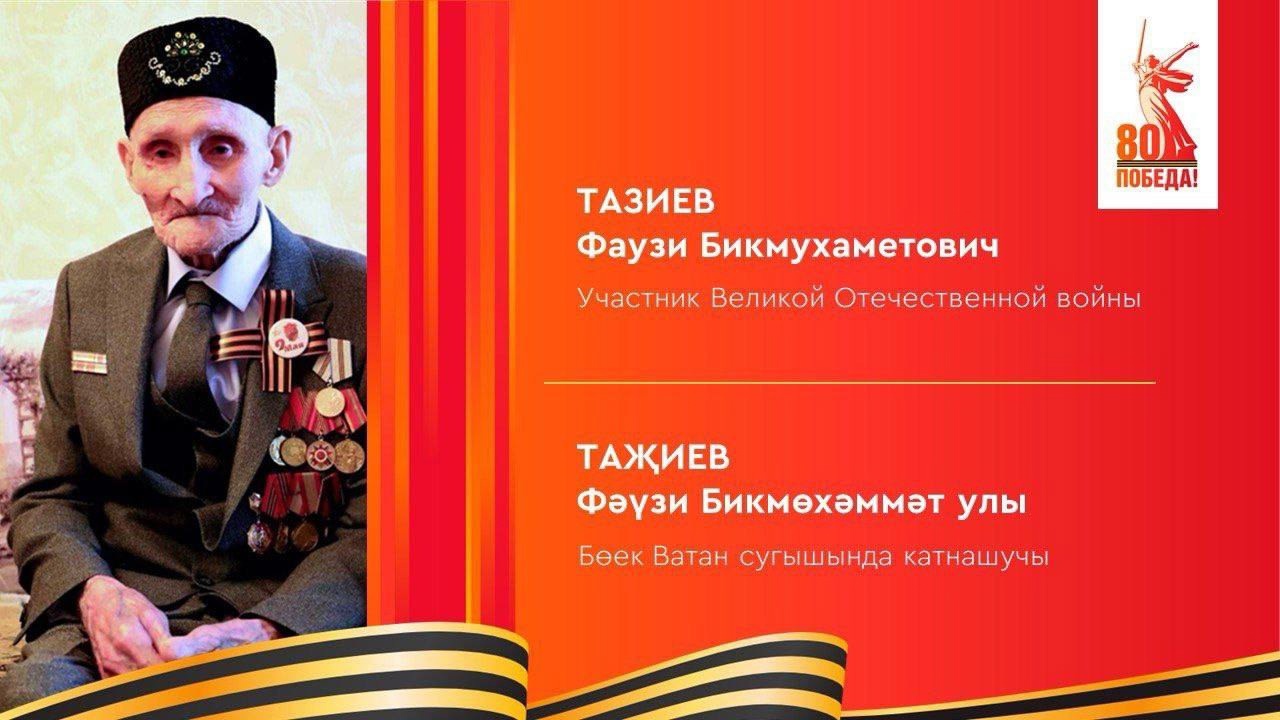 Тазиев — уроженец деревни Ташелга Муслюмовского района. Он служил в рядах Советской армии с 1943 по 1950 годы. Награжден медалью «За победу над Германией». В мирное время трудился слесарем в строительно-монтажном управлении в Муслюмовском районе и на «Нижнекамскнефтехиме».