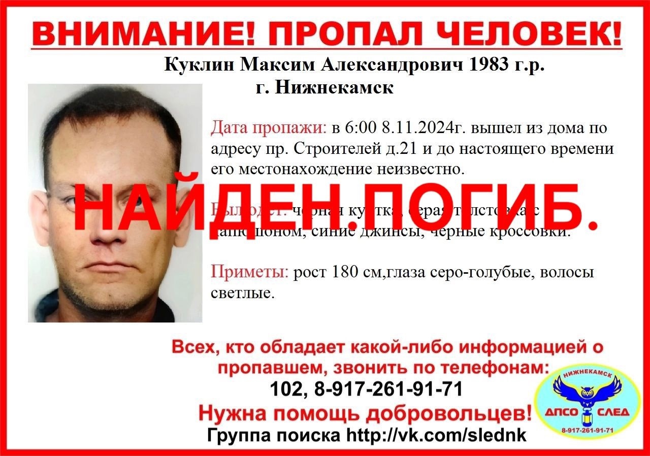 В Нижнекамске нашли тело пропавшего 8 ноября 41-летнего Максима Куклина. Информацию об этом в своих группах в социальных сетях опубликовали представители добровольного поисково-спасательного отряда «След».
