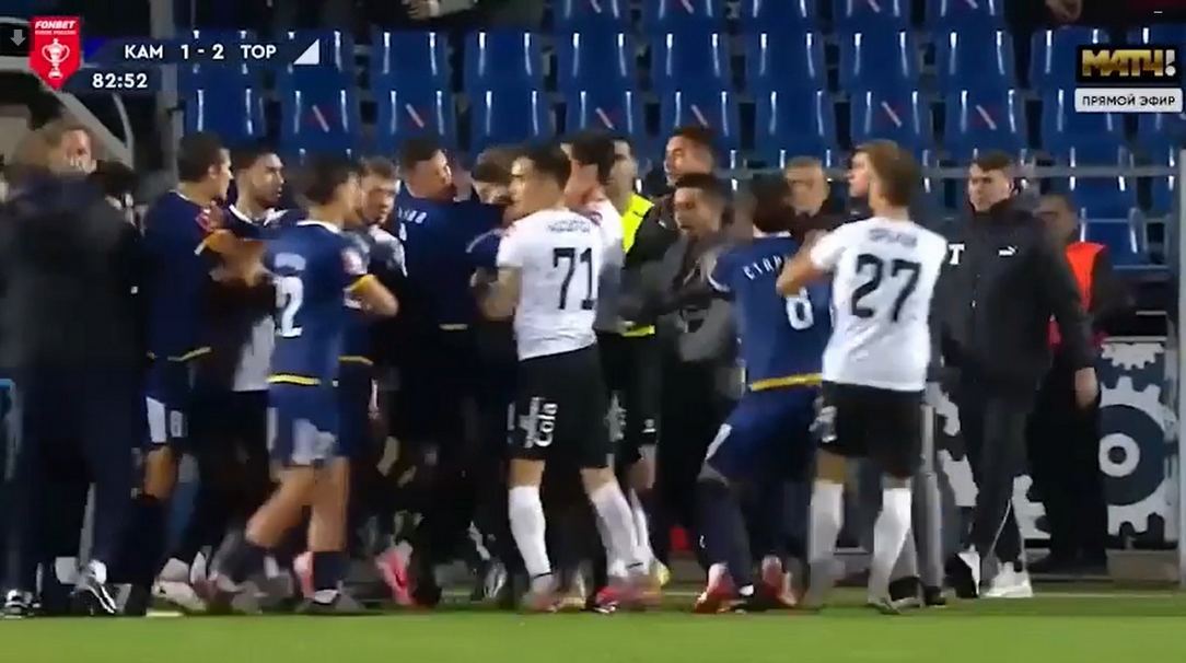 Массовая драка завязалась между московским «Торпедо» и челнинским «КАМАЗом» на матче Кубка России. Потасовка попала на видео. Судя по кадрам, ее спровоцировал главный тренер столичной футбольной команды Олег Кононов.