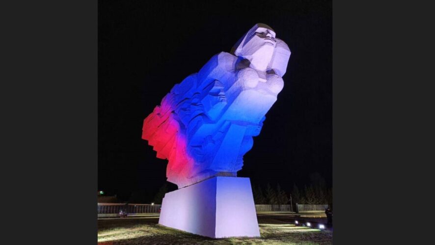У памятника «Родина-мать» в Челнах появилась праздничная подсветка в цветах флага России. Его также украсили флагами.