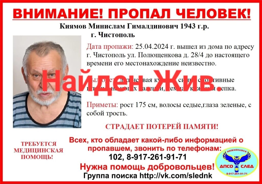 В социальных сетях волонтеры распространили ориентировку на пропавшего пенсионера из Чистополя. Родные предполагали: он мог уехать в Нижнекамск. При этом он страдает потерей памяти.