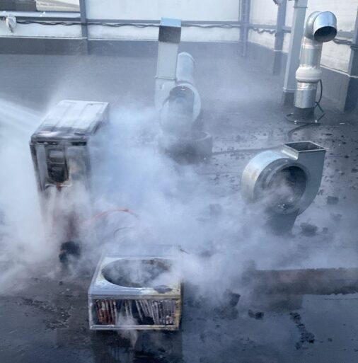 Без промедления курьер поднялся на крышу и приступил к тушению очага возгорания, который находился в месте прохода кабелей системы электроснабжения кондиционера.