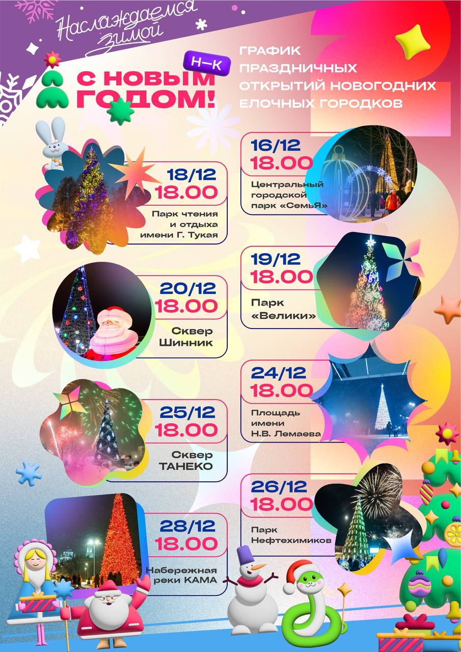 В городском парке «Семья» праздник запланирован на 16 декабря. Начало в 18:00. Следующий на очереди парк имени Габдуллы Тукая. Праздник там проведут также в 18:00 18 декабря. На следующий день мероприятие состоится в парке «Велики».