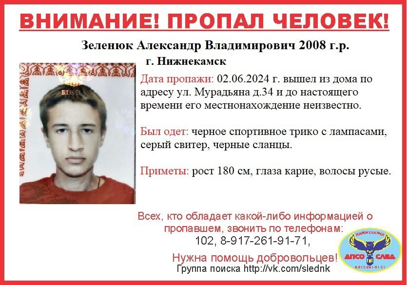 В Нижнекамске стало известно о еще одном пропавшем местном жителе. Волонтеры добровольного поисково-спасательного отряда «След» в своих группах в социальных сетях сообщают о пропаже 16-летнего Александра Зеленюка.