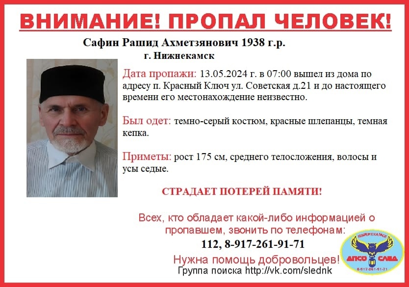 В Нижнекамске пропал 86-летний Рашид Сафин. Информацию об этом волонтеры добровольного поисково-спасательного отряда «След» опубликовали в своих группах в социальных сетях. Отмечается, что пенсионер страдает потерей памяти.
