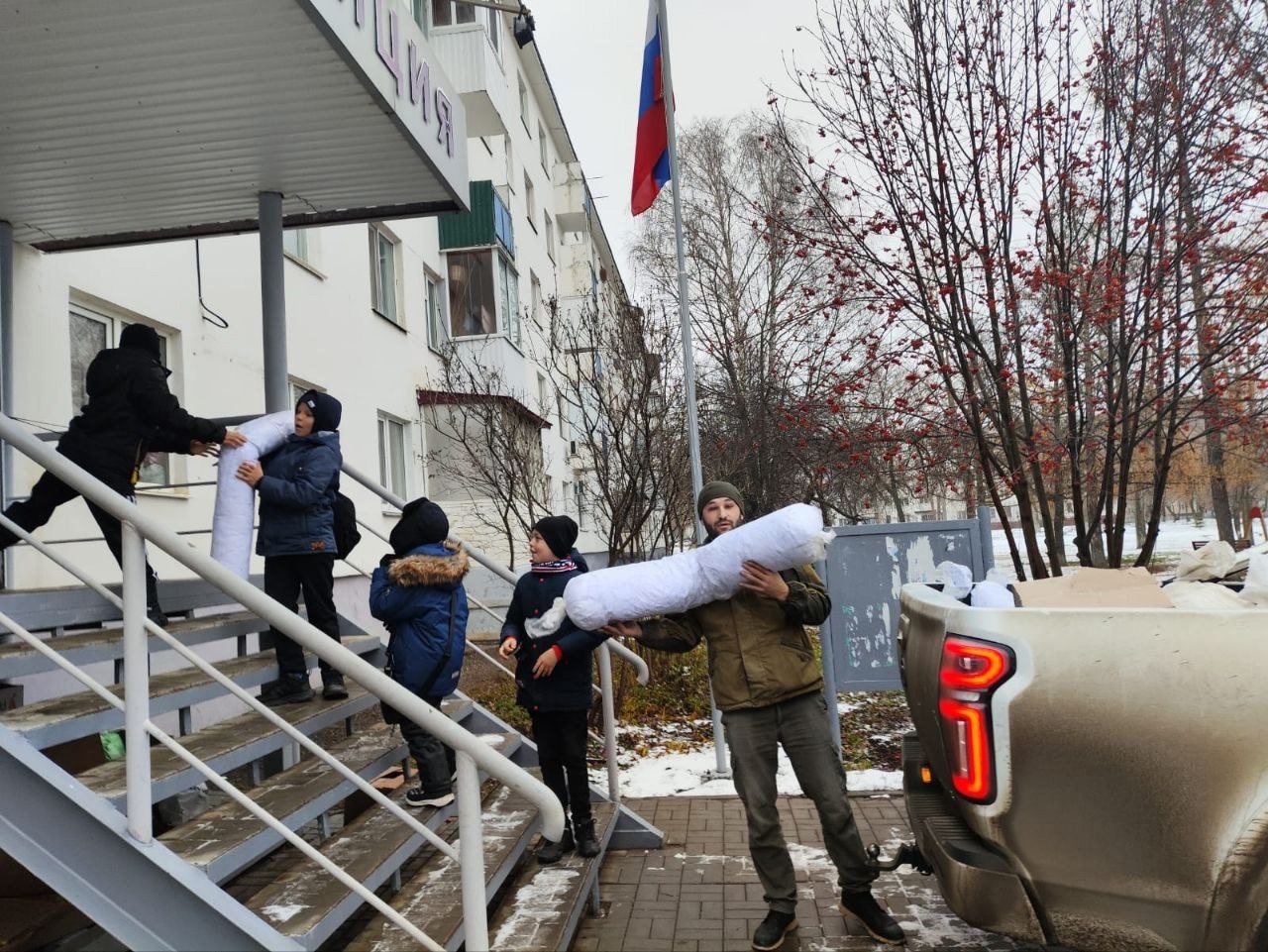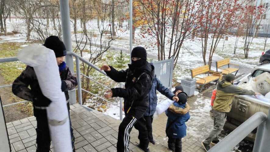 Мальчишки помогают переносить легкий груз, выносят мусор, собирают коробки. За ними закреплено и приведение в порядок территории у пункта сбора гуманитарной помощи на проспекте Химиков, 72Б.