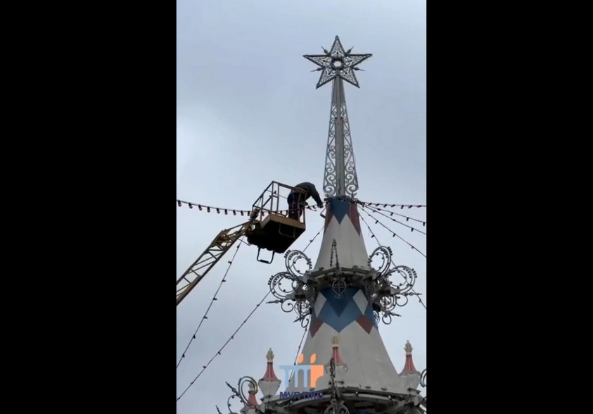 На кадрах видно, как рабочие вешают гирлянды на символ Нового года. По словам представителей муниципального предприятия, огоньки будут включать по вечерам, начиная с декабря.