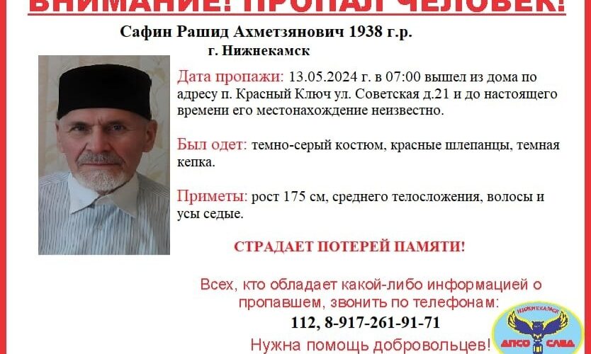 На потерявшемся были темно-серый костюм, красные шлепанцы, темная кепка. Рост пропавшего – 175 см, среднего телосложения, волосы и усы седые. Сафин страдает деменцией.