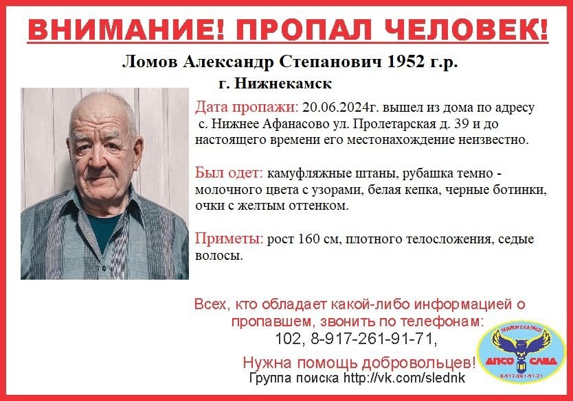 Волонтеры добровольного поисково-спасательного отряда «След» объявили о сборе на поиски пропавшего 72-летнего Александра Ломова. Для поисков нужны добровольцы.