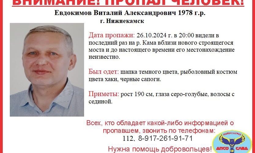 В Нижнекамске волонтеры добровольного поисково-спасательного отряда «След» начали поиски пропавшего рыбака. В последний раз 46-летнего Виталия Евдокимова видели поздним вечером 26 октября на реке Кама недалеко от нового строящегося моста.