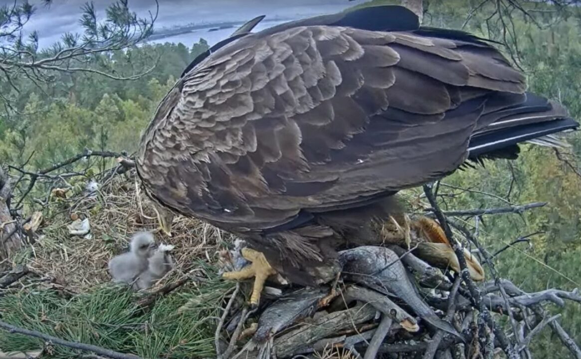 Напомним, первый птенец вылупился у орланов ранним утром 2 мая. Период насиживания в 2024 году составил 36 дней.