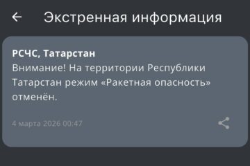 Режим ракетной опасности сняли в Татарстане 00:48 | 04-03-2026 Общество Режим «Ракетная опасность» отменили в Татарстане. Об этом сообщает МЧС России. В республике режим действовал почти два часа – сообщение от МЧС России пришло в 22:53. Вместе с этим в регионе отмечались перебои в работе мобильного интернета. Появились проблемы с... «Ракетная опасность» объявлена в соседних от Татарстана регионах – что известно 23:17 | 03-03-2026 Общество Во вторник, 3 марта, около 23 часов в Республике Татарстан объявили режим «Ракетная опасность». Также на территории региона введен режим «Беспилотная опасность». Об этом стало известно из официального приложения МЧС России. Согласно информации из телеграм-канала «Радар по всей России», подобная... Сирены звучат над Казанью из-за режима «Ракетная опасность» – видео 23:07 | 03-03-2026 Общество В Кировском районе Казани звучат сирены. Об этом KazanFirst сообщают очевидцы. Предварительно, их включили из-за режима «Ракетная опасность», которая действует в Татарстане с 22:53. МЧС России просит жителей и гостей республики принять меры безопасности – спуститься в укрытие и не... «Спуститесь в подвалы»: ракетную и беспилотную опасности объявили в Татарстане 22:58 | 03-03-2026 Общество В Татарстане объявлены режимы «Беспилотная опасность» и «Ракетная опасность». Об этом сообщает МЧС России. Сообщение от ведомства пришло в 22:53. Жителей и гостей республики просят принять меры безопасности – спуститься в укрытие и не подходить к окнам. Это второй раз,... Нижнекамск закупит десятки сирен после объявленного в РТ режима «Ракетная опасность» 12:06 | 02-03-2026 Общество До конца марта чиновники Нижнекамска планируют установить на улицах города 32 сирены. Соответствующее решение приняли после того, как в Татарстане на минувшей неделе впервые был введен режим «Ракетная опасность». Об этом на деловом понедельнике сообщил мэр Радмир Беляев. Представитель власти... Снова жертвы среди мирного населения: пять человек пострадали при массированной атаке ВСУ 10:29 | 02-03-2026 Происшествия Пять человек пострадали во время атаки ВСУ на Новороссийск. В результате нападения пострадали 17 домов, 8 из которых многоквартирные, и детский сад. Об этом сообщает ТАСС со ссылкой на губернатора Краснодарского края Вениамина Кондратьева. По словам губернатора, всем пострадавшим оказывают... Беляев о том, как отразилась ракетная опасность на Нижнекамске: Обстановка спокойная 15:44 | 27-02-2026 Общество Обстановка в Нижнекамске сейчас спокойная, несмотря на режим «Ракетная опасность», который действовал в Татарстане в течение нескольких часов. Об этом в своем телеграм-канале заявил мэр города Радмир Беляев. «Все ранее введенные ограничения сняты. Движение общественного транспорта осуществляется в штатном режиме,... Воздушную тревогу сняли в Альметьевске спустя два часа 15:08 | 27-02-2026 Общество Об отбое воздушной тревоги, объявленной на фоне введенного в Татарстане режима «Ракетная опасность», объявили чиновники Альметьевска. Соответствующую информацию опубликовали в телеграм-канале местной администрации. Напомним, что ракетную опасность объявили в республике 27 февраля. В Альметьевском районе была организована эвакуация детей в... Официально: рядом с Татарстаном силы ПВО сбили ракету 14:43 | 27-02-2026 Происшествия Ракету, летевшую по направлению к Республике Татарстан, сбили. Об этом сообщает 