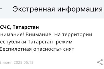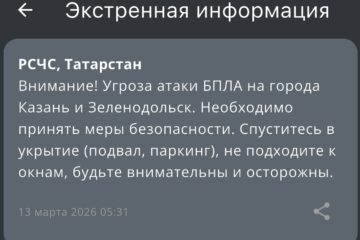 Ночная атака на Татарстан — в республике почти четыре часа был режим беспилотной опасности 06:00 | 17-11-2025 Происшествия Ночью в Татарстане вновь был введен режим беспилотной опасности. Сообщение от МЧС России поступило около двух часов ночи. Уже привычно появились проблемы с мобильным интернетом, перестали работать основные мессенджеры, наблюдались с ложности с вызовом такси. В 5:43 режим беспилотной опасности отменили.... Атака с неба — в Татарстане введен режим беспилотной опасности 06:04 | 12-11-2025 Происшествия Режим беспилотной опасности вновь объявлен на территории Республики Татарстан. Сообщение от МЧС России поступило в пятом часу утра. Одновременно с введенным режимом в Казани и других городах РТ появились проблемы с мобильным интернетом, не грузятся основные приложения, практически невозможно вызвать... МЧС напомнило, как татарстанцам вести себя при угрозе атаки БПЛА 07:44 | 15-10-2025 Общество ГУ МЧС России по РТ опубликовало инструкцию о правилах поведения во время атаки БПЛА. Памятка размещена в официальном телеграм-канале ведомства. Спасатели советуют тем, кто находится на улице, немедленно укрыться в ближайшем здании, подземном переходе или паркинге. Если человек едет на... Сразу пять городов под ударом: жителей Татарстана просят пройти в укрытие 07:10 | 15-10-2025 Общество Жителей сразу пяти городов Татарстана призвали пройти в укрытия из-за объявления угрозы атаки БПЛА. Сообщение об этом появилось в официальном приложении МЧС России. Под угрозу попали Елабуга, Нижнекамск, Заинск, Набережные Челны и Альметьевск. Напомним, что с 6:29 в Татарстане действует... Забирать детей не нужно: в Управлении образования Казани о ситуациях в городских школах 10:20 | 23-09-2025 Общество Сегодня в казанских школах и детских садах педагоги переводят детей в предусмотренные безопасные помещения. Как сообщили в Управлении образования, это стандартная мера предосторожности. Учебный процесс продолжается, дети находятся под присмотром педагогов. Забирать их домой сейчас не требуется — все условия... Спуститесь в укрытие: в Нижнекамске и Елабуге объявили угрозу атаки БПЛА 05:57 | 01-09-2025 Происшествия Угрозу атаки БПЛА объявили сразу в двух городах Татарстана. Речь идет о Нижнекамске и Елабуге. Сообщение с предостережением поступило от МЧС России в 3:54. «Внимание! Угроза атаки БПЛА на города Нижнекамск и Елабуга. Необходимо принять меры безопасности. Спуститесь в укрытие... Угроза атаки беспилотников объявлена в Альметьевском районе 08:38 | 04-07-2025 Происшествия Угроза атаки БПЛА объявлена в Альметьевском районе. Об этом сообщили в пресс-службе Альметьевского муниципального района и города Альметьевск. Кроме того, в самом городе в зонах повышенной опасности звучат сигналы сирены. Жителей просят немедленно спрятаться в ближайших защитных сооружениях и оставаться... План «Ковер» ввели в Нижнекамске, аэропорт закрыт 08:09 | 04-07-2025 Происшествия В Нижнекамске временно закрыли аэропорт. Там объявлен режим «Ковёр». Такую информацию прислала РСЧС. Воздушная гавань некоторое время не будет выпускать и принимать самолеты. Причина этому угроза атаки беспилотников, которую объявили сегодня утром. По этой же причины до этого закрыли казанский... Снова без связи: в Татарстане тормозит интернет из-за угрозы беспилотников 08:37 | 03-07-2025 Общество В Татарстане снова наблюдаются проблемы с м