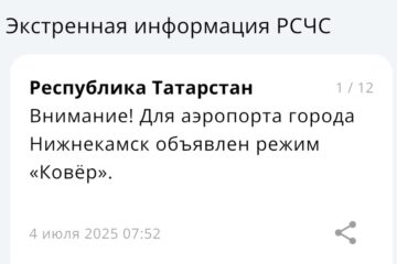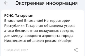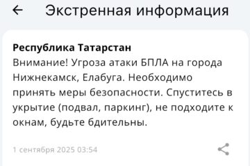 Атака с неба — в Татарстане введен режим беспилотной опасности 06:04 | 12-11-2025 Происшествия Режим беспилотной опасности вновь объявлен на территории Республики Татарстан. Сообщение от МЧС России поступило в пятом часу утра. Одновременно с введенным режимом в Казани и других городах РТ появились проблемы с мобильным интернетом, не грузятся основные приложения, практически невозможно вызвать... МЧС напомнило, как татарстанцам вести себя при угрозе атаки БПЛА 07:44 | 15-10-2025 Общество ГУ МЧС России по РТ опубликовало инструкцию о правилах поведения во время атаки БПЛА. Памятка размещена в официальном телеграм-канале ведомства. Спасатели советуют тем, кто находится на улице, немедленно укрыться в ближайшем здании, подземном переходе или паркинге. Если человек едет на... Сразу пять городов под ударом: жителей Татарстана просят пройти в укрытие 07:10 | 15-10-2025 Общество Жителей сразу пяти городов Татарстана призвали пройти в укрытия из-за объявления угрозы атаки БПЛА. Сообщение об этом появилось в официальном приложении МЧС России. Под угрозу попали Елабуга, Нижнекамск, Заинск, Набережные Челны и Альметьевск. Напомним, что с 6:29 в Татарстане действует... Забирать детей не нужно: в Управлении образования Казани о ситуациях в городских школах 10:20 | 23-09-2025 Общество Сегодня в казанских школах и детских садах педагоги переводят детей в предусмотренные безопасные помещения. Как сообщили в Управлении образования, это стандартная мера предосторожности. Учебный процесс продолжается, дети находятся под присмотром педагогов. Забирать их домой сейчас не требуется — все условия... Спуститесь в укрытие: в Нижнекамске и Елабуге объявили угрозу атаки БПЛА 05:57 | 01-09-2025 Происшествия Угрозу атаки БПЛА объявили сразу в двух городах Татарстана. Речь идет о Нижнекамске и Елабуге. Сообщение с предостережением поступило от МЧС России в 3:54. «Внимание! Угроза атаки БПЛА на города Нижнекамск и Елабуга. Необходимо принять меры безопасности. Спуститесь в укрытие... Угроза атаки беспилотников объявлена в Альметьевском районе 08:38 | 04-07-2025 Происшествия Угроза атаки БПЛА объявлена в Альметьевском районе. Об этом сообщили в пресс-службе Альметьевского муниципального района и города Альметьевск. Кроме того, в самом городе в зонах повышенной опасности звучат сигналы сирены. Жителей просят немедленно спрятаться в ближайших защитных сооружениях и оставаться... План «Ковер» ввели в Нижнекамске, аэропорт закрыт 08:09 | 04-07-2025 Происшествия В Нижнекамске временно закрыли аэропорт. Там объявлен режим «Ковёр». Такую информацию прислала РСЧС. Воздушная гавань некоторое время не будет выпускать и принимать самолеты. Причина этому угроза атаки беспилотников, которую объявили сегодня утром. По этой же причины до этого закрыли казанский... Снова без связи: в Татарстане тормозит интернет из-за угрозы беспилотников 08:37 | 03-07-2025 Общество В Татарстане снова наблюдаются проблемы с мобильным интернетом. Проблемы с подключением наблюдаются в Казани и других городах республики. Оплатить проезд, выйти в интернет, зайти в приложения банков и мессенджеры получается с трудом. Не исключено, что причиной этому является опасность атаки... Вслед за Казанью небо закрыли над Нижнекамском 07:44 | 01-07-2025 Общество В Татарстане из-за угрозы атаки вражеских беспилотников в аэропорту Нижнекамска объявлен режим «Ковёр