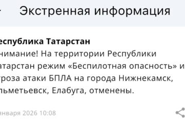 Дроны атакуют Татарстан — в двух городах республики объявлена угроза атаки БПЛА 04:57 | 17-02-2026 Происшествия Угроза атаки беспилотными летающими средствами объявлена сразу в двух городах Татарстана — в Набережных Челнах и Альметьевске. Сообщение об этом поступило около пяти утра от МЧС России. Жителям и гостям республики настоятельно советуют принять все меры безопасности — спуститься в... Казань под ударом: в столице объявлена угроза атаки БПЛА 05:25 | 11-02-2026 Происшествия Угроза атаки БПЛА объявлена в Казани. Сообщение от МЧС России поступило в 05.21. Жителям и гостям столицы настоятельно советуют принять все необходимые меры безопасности. В первую очередь, по возможности спуститься в укрытие (подвал или паркинг). Также стоит держаться подальше от... Беспилотную опасность и угрозу атаки БПЛА сняли в Татарстане 10:14 | 06-01-2026 Общество В Татарстане отменили беспилотную опасность и угрозу атаки БПЛА на города Нижнекамск, Альметьевск и Елабуга. Об этом сообщает РСЧС. Режим ввели сегодня примерно в 11 часов вечера. Через три часа в Альметьевске, Нижнекамске и Елабуге объявили угрозу атаки БПЛА. Жителей... Спуститесь в укрытие: угроза атаки БПЛА объявлена сразу в трех городах Татарстана 07:42 | 06-01-2026 Происшествия Угроза атаки дронов объявлена сразу в трех городах Татарстана — Нижнекамске, Альметьевске и Елабуге. Сообщение об этом поступило от МЧС России. Кроме того, на прием и выпуск самолетов закрыты обо республиканских аэропорта — в Казани и Нижнекамске. Жителей и гостей... Ночная атака на Татарстан — в республике почти четыре часа был режим беспилотной опасности 06:00 | 17-11-2025 Происшествия Ночью в Татарстане вновь был введен режим беспилотной опасности. Сообщение от МЧС России поступило около двух часов ночи. Уже привычно появились проблемы с мобильным интернетом, перестали работать основные мессенджеры, наблюдались с ложности с вызовом такси. В 5:43 режим беспилотной опасности отменили.... Атака с неба — в Татарстане введен режим беспилотной опасности 06:04 | 12-11-2025 Происшествия Режим беспилотной опасности вновь объявлен на территории Республики Татарстан. Сообщение от МЧС России поступило в пятом часу утра. Одновременно с введенным режимом в Казани и других городах РТ появились проблемы с мобильным интернетом, не грузятся основные приложения, практически невозможно вызвать... МЧС напомнило, как татарстанцам вести себя при угрозе атаки БПЛА 07:44 | 15-10-2025 Общество ГУ МЧС России по РТ опубликовало инструкцию о правилах поведения во время атаки БПЛА. Памятка размещена в официальном телеграм-канале ведомства. Спасатели советуют тем, кто находится на улице, немедленно укрыться в ближайшем здании, подземном переходе или паркинге. Если человек едет на... Сразу пять городов под ударом: жителей Татарстана просят пройти в укрытие 07:10 | 15-10-2025 Общество Жителей сразу пяти городов Татарстана призвали пройти в укрытия из-за объявления угрозы атаки БПЛА. Сообщение об этом появилось в официальном приложении МЧС России. Под угрозу попали Елабуга, Нижнекамск, Заинск, Набережные Челны и Альметьевск. Напомним, что с 6:29 в Татарстане действует... Забирать детей не нужно: в Управлении образования Казани о ситуациях в городских школах 10:20 | 23-09-2025 Общество Сегодня в казанских школах и детских садах педагоги переводят детей в предусмотренные безопасные помещения. Как сооб
