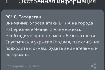 Звучат сирены, черный дым над городом – что происходит в Альметьевске в данный момент 09:25 | 24-02-2026 Происшествия В Альметьевске звучат сирены, сообщает телеграм-канал «В Татарстане поймут». На кадрах, опубликованных в канале, слышно, что сирены громко звучат над городом. Сообщается, что детей прямо сейчас спускают в подвалы из-за угрозы БПЛА. Происходит это только в зонах повышенного риска,... Угроза республике — в Татарстане вновь введен режим беспилотной опасности 05:53 | 20-02-2026 Происшествия Режим беспилотной опасности вновь введен в Татарстане. Сообщение от МЧС России поступило в третьем часу ночи. Одновременно с введением режима в РТ заметно замедлился мобильный интернете. Появились проблемы с входом в онлайн-приложения, вызовом такси, а также наблюдаются сбои в работе... Пугающая тенденция: Татарстан снова под ударом, вражеские дроны атакуют – итоги вторника 18:52 | 17-02-2026 Общество Вот уже который раз враг атакует Республику Татарстана. Налеты происходят, как правило, ночью. Вторник, 17 февраля, не стал исключением. Около двух часов ночи в республике был объявлен режим беспилотной опасности. Не прошло и часа – на прием и выпуск судов... Дроны атакуют Татарстан — в двух городах республики объявлена угроза атаки БПЛА 04:57 | 17-02-2026 Происшествия Угроза атаки беспилотными летающими средствами объявлена сразу в двух городах Татарстана — в Набережных Челнах и Альметьевске. Сообщение об этом поступило около пяти утра от МЧС России. Жителям и гостям республики настоятельно советуют принять все меры безопасности — спуститься в... Казань под ударом: в столице объявлена угроза атаки БПЛА 05:25 | 11-02-2026 Происшествия Угроза атаки БПЛА объявлена в Казани. Сообщение от МЧС России поступило в 05.21. Жителям и гостям столицы настоятельно советуют принять все необходимые меры безопасности. В первую очередь, по возможности спуститься в укрытие (подвал или паркинг). Также стоит держаться подальше от... Беспилотную опасность и угрозу атаки БПЛА сняли в Татарстане 10:14 | 06-01-2026 Общество В Татарстане отменили беспилотную опасность и угрозу атаки БПЛА на города Нижнекамск, Альметьевск и Елабуга. Об этом сообщает РСЧС. Режим ввели сегодня примерно в 11 часов вечера. Через три часа в Альметьевске, Нижнекамске и Елабуге объявили угрозу атаки БПЛА. Жителей... Спуститесь в укрытие: угроза атаки БПЛА объявлена сразу в трех городах Татарстана 07:42 | 06-01-2026 Происшествия Угроза атаки дронов объявлена сразу в трех городах Татарстана — Нижнекамске, Альметьевске и Елабуге. Сообщение об этом поступило от МЧС России. Кроме того, на прием и выпуск самолетов закрыты обо республиканских аэропорта — в Казани и Нижнекамске. Жителей и гостей... Ночная атака на Татарстан — в республике почти четыре часа был режим беспилотной опасности 06:00 | 17-11-2025 Происшествия Ночью в Татарстане вновь был введен режим беспилотной опасности. Сообщение от МЧС России поступило около двух часов ночи. Уже привычно появились проблемы с мобильным интернетом, перестали работать основные мессенджеры, наблюдались с ложности с вызовом такси. В 5:43 режим беспилотной опасности отменили.... Атака с неба — в Татарстане введен режим беспилотной опасности 06:04 | 12-11-2025 Происшествия Режим беспилотной опасности вновь объявлен на территории Республики Татарстан. Сообщение от МЧС России поступило в пятом часу утра. Одновремен