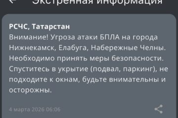Удар по Казани — ещё в двух городах Татарстана угроза атаки беспилотников 05:35 | 13-03-2026 Происшествия Угроза атаки БПЛА объявлена еще в двух городах Татарстана — в Казани и Зеленодольске. Об этом сообщает МЧС России. Жителям и гостям городов необходимо спуститься в укрытия — это могут быть подвалы или паркинги. Не стоит подходить к окнам, входить... Удар по Татарстану — в трех городах республики угроза атаки БПЛА, небо закрыто 05:41 | 11-03-2026 Происшествия Неспокойной выдалась эта ночь для жителей и гостей Татарстана. Около трех часов ночи был объявлен режим беспилотной опасности. Сообщение поступило от МЧС России. Спустя час объявили, что прием и выпуск судов временно не осуществляет Международный аэропорт «Казань». Вслед ним закрыли... Татарстан под ударом — сразу в трех городах объявлена угроза атаки БПЛА 06:08 | 04-03-2026 Происшествия Сразу в трех городах Татарстана объявлена угроза атаки БПЛА. Под ударом оказались Елабуга, Набережные Челны и Нижнекамск. Сообщение с предупреждением поступило от МЧС России. Жителям и гостям городов необходимо принять меры безопасности — срочно спуститься в укрытие — это может... Ещё три города под обстрелом — угроза атаки БПЛА объявлена в Нижнекамске, Елабуге, Заинске 10:02 | 24-02-2026 Происшествия Угроза атаки БПЛА объявлена на города Нижнекамск, Елабуга, Заинск, сообщает официальное приложение МЧС России. Нужно принять меры безопасности: спуститься в укрытие (подвал и паркинг), не подходить к окнам. Жителям важно быть внимательными и осторожными. Звучат сирены, черный дым над городом – что происходит в Альметьевске в данный момент 09:25 | 24-02-2026 Происшествия В Альметьевске звучат сирены, сообщает телеграм-канал «В Татарстане поймут». На кадрах, опубликованных в канале, слышно, что сирены громко звучат над городом. Сообщается, что детей прямо сейчас спускают в подвалы из-за угрозы БПЛА. Происходит это только в зонах повышенного риска,... Угроза республике — в Татарстане вновь введен режим беспилотной опасности 05:53 | 20-02-2026 Происшествия Режим беспилотной опасности вновь введен в Татарстане. Сообщение от МЧС России поступило в третьем часу ночи. Одновременно с введением режима в РТ заметно замедлился мобильный интернете. Появились проблемы с входом в онлайн-приложения, вызовом такси, а также наблюдаются сбои в работе... Пугающая тенденция: Татарстан снова под ударом, вражеские дроны атакуют – итоги вторника 18:52 | 17-02-2026 Общество Вот уже который раз враг атакует Республику Татарстана. Налеты происходят, как правило, ночью. Вторник, 17 февраля, не стал исключением. Около двух часов ночи в республике был объявлен режим беспилотной опасности. Не прошло и часа – на прием и выпуск судов... Дроны атакуют Татарстан — в двух городах республики объявлена угроза атаки БПЛА 04:57 | 17-02-2026 Происшествия Угроза атаки беспилотными летающими средствами объявлена сразу в двух городах Татарстана — в Набережных Челнах и Альметьевске. Сообщение об этом поступило около пяти утра от МЧС России. Жителям и гостям республики настоятельно советуют принять все меры безопасности — спуститься в... Казань под ударом: в столице объявлена угроза атаки БПЛА 05:25 | 11-02-2026 Происшествия Угроза атаки БПЛА объявлена в Казани. Сообщение от МЧС России поступило в 05.21. Жителям и гостям столицы настоятельно советуют принять все необходимые меры безопасности. В 